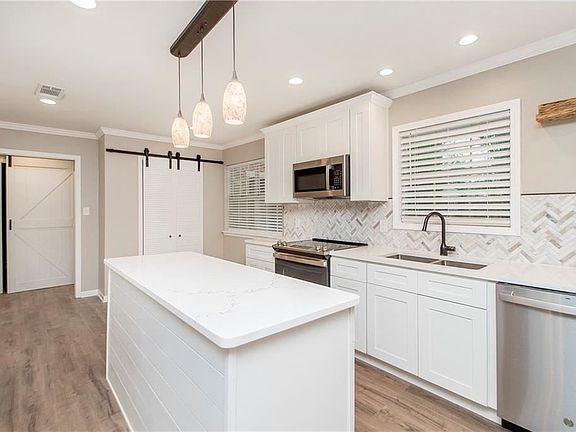 Massive renovation makes this one a must see! Brand new flooring in 50% of the home, completely new kitchen w/quartz countertops & brand new stainless steel appliances, including refrigerator! Personal details to the reno make it one of my favorites!!! Original layout transformed to new, modern look. Chose where you want to hang out.....small living or larger den off the kitchen for entertaining. Master bath has double vanity & tiled walk-in shower. Modern fixtures/new ceiling fans & lighting throughout.