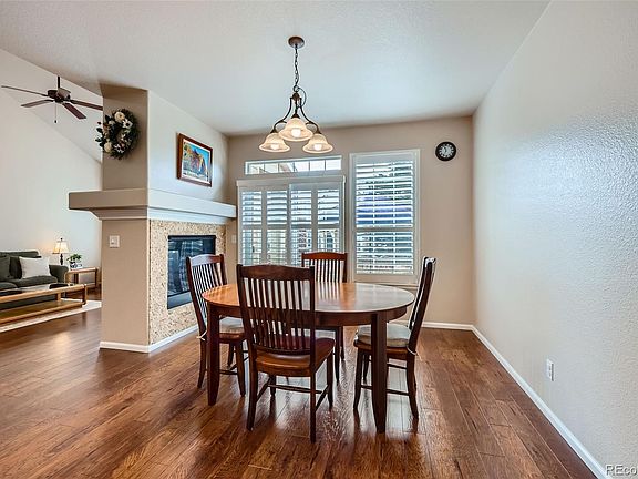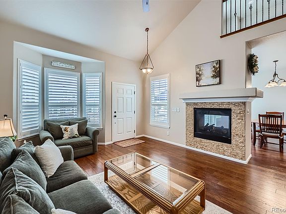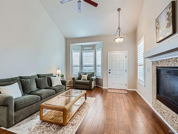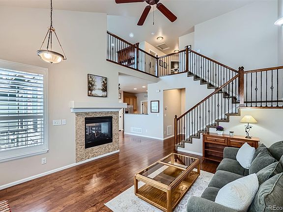 Offering a southwest exposure with ample natural sunlight and many large windows with Plantation Shutters, the vaulted Living Room features a bay window, ceiling fan and two-sided gas log fireplace. The open Dining Room has 9-foot ceilings and shares the fireplace. The Dining Room has a glass sliding door with Plantation Shutters opening to a large concrete patio with great space for dining, entertaining and some mountain views. The gourmet kitchen features granite countertops, tile backsplash, breakfast bar, 42" maple cabinets, pantry, GE Profile stainless steel appliances including a 4-burner gas range. The artistic staircase to the second floor elegantly features wrought-iron balusters, hardwood handrail, and carpeted stairway. Upstairs, the large open loft is perfect for an office or study with a custom built-in desk and upper cabinets, carpeting, large window with Plantation Shutters and some mountain views. The luxurious Primary Bedroom Suite with vaulted ceiling and ceiling fan has custom California Closets built-in. The spacious 5-piece bathroom features double sinks, tile countertops, soaking tub, shower and tile floor. A comfortable second bedroom and upper-level bathroom with tile flooring completes the upper level. On the main level the Laundry Room includes a newer washer and dryer and upper cabinets. This lovely home also includes air conditioning, recent interior paint, a full basement for extra storage with a large egress window, and increased attic insulation. The attached 2-car garage with garage door opener has additional storage space, convenient hose bibb, and drywall and taped insulated walls. This home's great location in Castle Rock is surrounded by the Metzler Family Open Space and trails, is close to shopping and restaurants, with easy access to I-25. Can have a quick close and it's ready to move in!