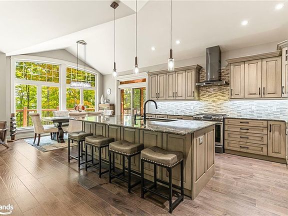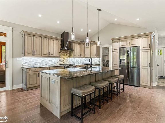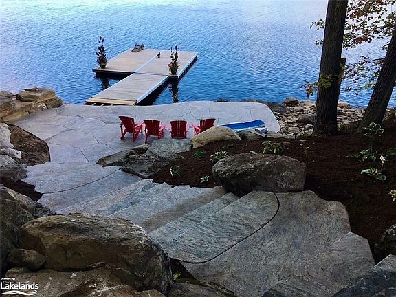 Nestled on 20 acres of beautifully landscaped and well-treed land, this luxurious waterfront home on Twelve Mile Lake offers ultimate privacy and elegance. Built in 2018, this 4,600 sq. ft. custom home features 5 bedrooms + office & 4 bathrooms, designed with hosting in mind. The open-concept layout boasts a stunning stone fireplace, expansive windows, & a cathedral ceiling that floods the space with natural light. High-end finishes include hickory hardwood flooring, custom walnut kitchen cabinetry, Cambria quartz countertops, & travertine marble, offering a refined touch throughout. Enjoy 103 ft of southeast-facing waterfront with breathtaking big lake views of Twelve Mile Lake, part of a 3-lake chain perfect for endless boating adventures. The professionally landscaped shoreline includes a granite patio, built-in BBQ, & a large aluminum dock system, ideal for deep, clear water swimming. Explore walking trails through mature hardwood forest on the 20-acre property, ensuring complete seclusion. The attached 32' x 26' garage is insulated with in-floor radiant heating, & above it is a 652 sq. ft. self contained guest suite complete with a kitchenette, living/dining area, bedroom, & 3-piece bath (included in bed/bath count & total living space square footage). The detached, insulated 24' x 14' workshop adds additional space for projects. Easily accessible year-round, this home is less than 15 minutes from Minden & close to trails, skiing, golf, & other recreation. Walk to nearby restaurants, breweries, the LCBO, & convenience stores—perfect for enjoying all the area has to offer.