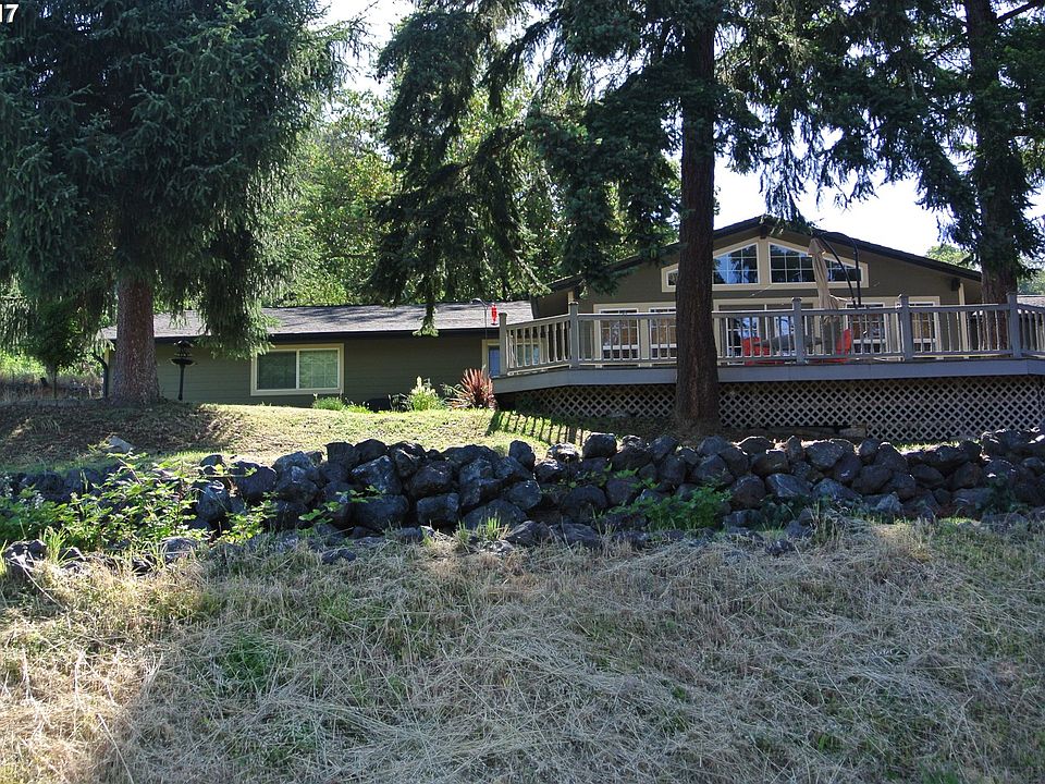 One level, large open floor plan. Home has lot's of windows, three bedrooms and three baths. Remodeling has been done in all bathrooms and has separation between living room and family room. It has an office area and a nice laundry room, as well as a light and open dining area that opens onto a large deck. Lots of wildlife to see and enjoy, including deer, wild turkeys, humming birds etc. There is a large shop, 36x40.