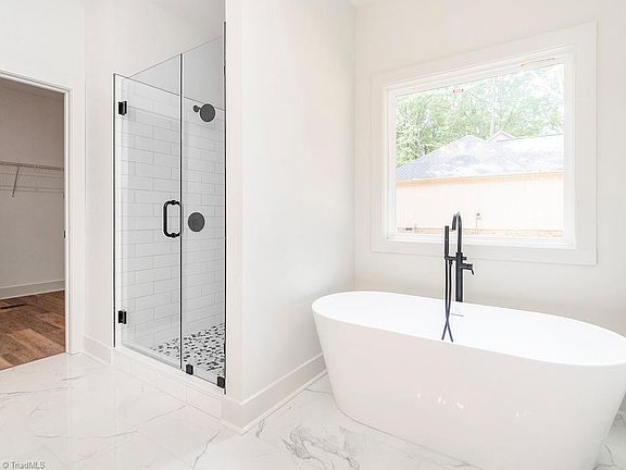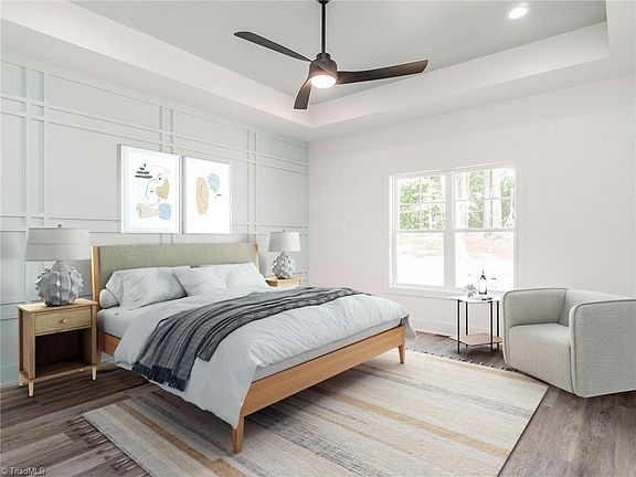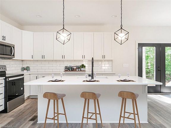 Welcome to your dream home in Southern Alamance! This stunning new construction features 3 bedrooms, 2 baths, and a home office, all situated on a peaceful and serene lot. Step inside to find a charming front porch with stacked stone accents leading into an open layout kitchen with white cabinets, quartz countertops, and black fixtures. The dining room and home office boast cozy black walls and modern light fixtures, creating a stylish and inviting space. The primary suite is a luxurious retreat with an accent trim wall, sleek modern fan, and a spa-like ensuite bathroom featuring double raised vanities, custom farmhouse mirrors, marble-style floors, and a subway tile shower. The huge walk-in closet provides ample storage space. Two guest bedrooms share a hall bath with a tub shower. Outside, relax on the back patio and enjoy the tranquility of nature. Don't miss out on this exceptional home - schedule a showing today!