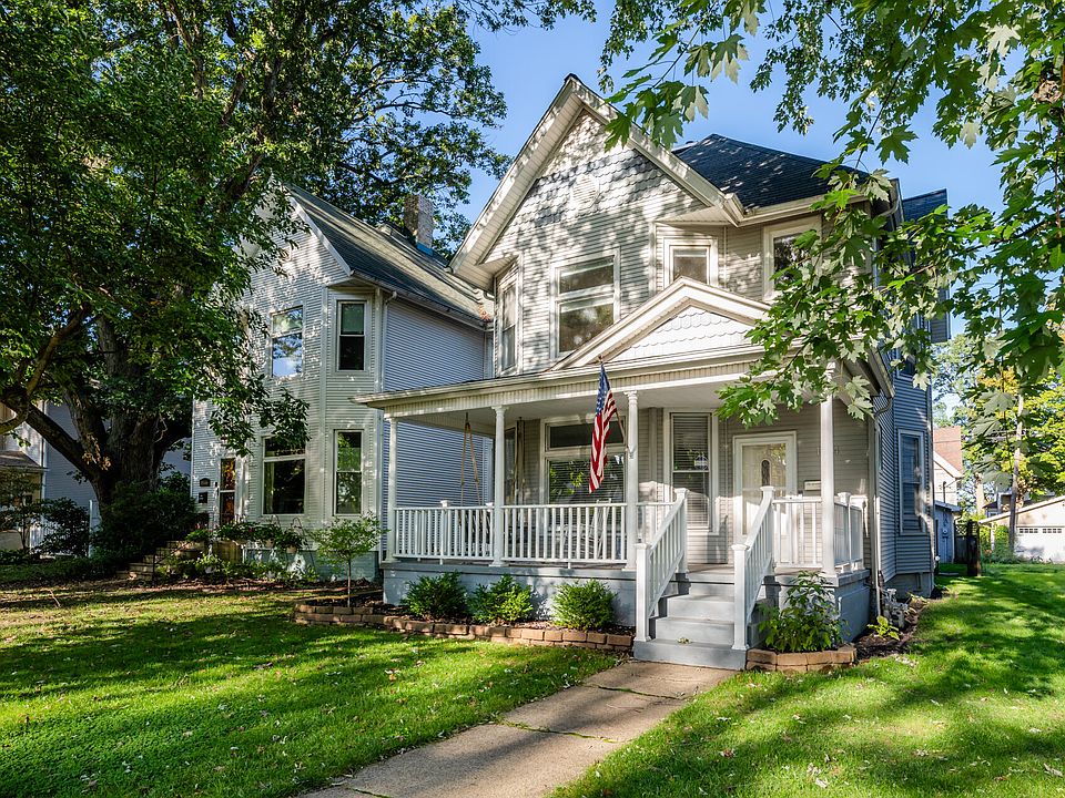 Updated historical home on highly sought after State Street. This great property invites you in with the lovely covered front deck and vintage charms throughout. New custom kitchen with quartz counters, stainless steel appliances including double oven, heated tile floor, new cabinets and eating area. New flooring throughout the main including new mudroom, living room, half bath and laundry, front office area and dining room. Upper level includes 3 bedrooms and 2 updated full bathrooms. Primary suite with steam shower, heated floors, slider to a private deck and a circular staircase to the third level entertainment space/study. Large closets and big bright windows. Basement is great for storage and very dry for downtown. The wine cellar. New furnace, Ayers drying system, instant hot water heater, new venting, wash sink and 200 amp service. Don't miss the two car garage and the fenced in rear yard.