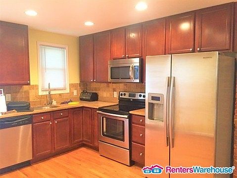 If you love a good yard this is for you. This row home is totally renovated with very nice finishes. The sun filled main level is a completely open concept with a stainless kitchen, granite countertops, beautiful hardwood floors, and a powder room. Upstairs are two pretty comparable bedrooms. The master has it's own bathroom with jacuzzi tub. The second bedroom has full use of the hall bathroom. Both baths are tastefully updated with nice ceramic finishes. The basement is clean and dry with washer dryer and extra storage. The sizeable yard is surrounded by a privacy fence. It comes with a spacious deck, deck furniture, and a large newer gas grill. Convenient to all things Hampden...it's just a walk to the Avenue. Also very accessible to the bus and less than a mile to the light rail. No cats, please. Available Now. Call Rose 410-598-1501