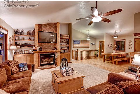 Property boasts an impressive amount of space w 5 beds 3 baths & 3-car attached garage. Sprawling backyard & west-facing deck offer breathtaking mtn views & outdoor living space. Home features wood burning fire place new hardwood floors theater projector & fun laundry chute. Bring horses alpacas chickens & other furry friends. 1000 SF backyard barn includes tack room or office. Enjoy quiet country living at its finest a couple of mins from downtown Berthoud! * 2 shares of HOA ditch irrigation*