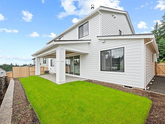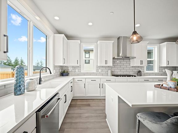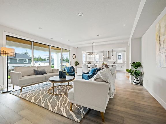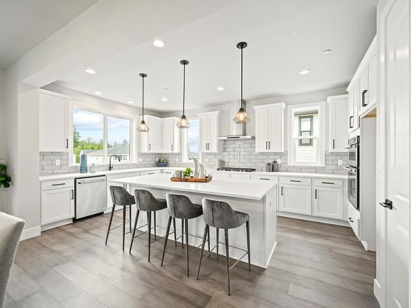 The Trillium's inviting stepped covered porch and entry flow into the foyer, opening immediately onto a bright living room and casual dining area with views to the spacious family room beyond. The well-designed kitchen with white shaker cabinets offers a large center island, quartz counter tops, and a sizable walk-in pantry. The elegant master bedroom is highlighted by a tray ceiling, dual walk-in closets, and deluxe master bath with dual-sink vanity, large soaking tub, luxe glass-enclosed shower, and private water closet. Central to a generous loft, secondary bedrooms feature roomy closets and shared full bath with separate dual-sink vanity area. Additional highlights include a desirable first floor bedroom at rear of home, with closet and shared full hall bath. Farmhouse with 3-car garage and covered outdoor patio. First floor bedroom and bathroom with open kitchen and great room. Disclaimer: Photos are images only and should not be relied upon to confirm applicable features.