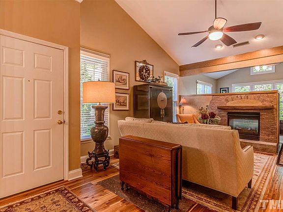 Lovely END UNIT townhome w/ FIRST FLOOR MASTER. Soaring ceilings & hardwood floors throughout first floor. All new windows triple/pane in 2016. Gourmet kitchen cabinets with high /end granite, cooper Farm sink. New 4 door Samsung refrig w/ convertible lower door to freezer.1st flr Master Bdrm & Bath w/ tile flrs & large WIC. Dual-sided gas log fireplace between family room& sunroom. 2 spacious Bdrms on 2nd Floor. Deck overlooks natural area. 1-car Gar w/ custom rolling gate door. Walk to shops.