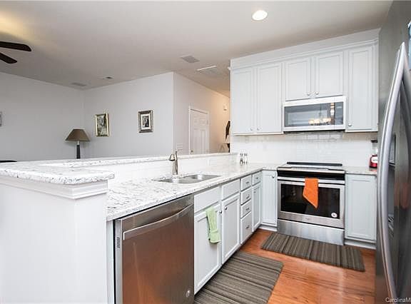 Beautiful, 2 story end unit townhome in prime Ballantyne location. 1 car attached garage with keypad entry. Open floor plan with powder room on the main level for your convenience. Many fabulous upgrades: Granite counters, subway tile backsplash and stainless appliances in the kitchen, New HVAC unit added, plus 5" hardwood floors throughout the main level. Upper level features double loft, spacious master suite with walk-in closet, laundry, and guest bed and bath.Relax on the rear deck and enjoy the peaceful views. Easy access to great schools, mall, interstate, attractions and more! Don't miss out on this rare gem!