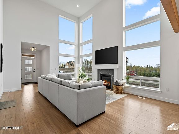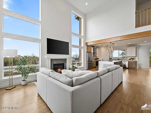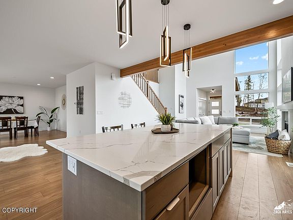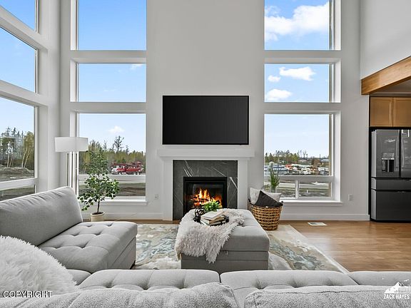 Better than new construction in South Anchorage, without the wait! Lived in only 5 months, this modern luxury home has been customized with extensive upgrades for long term enjoyment. Sellers career now calls for a move. Just pick out your exterior paint color, already paid for, to go with the stone facade to be installed this spring.Optimally located on the lower hillside, enjoy abundant recreation, sunlight and mountains with a convenient commute year round. Top-of-the-line Bosch and Café appliances, Tesla level 2 charging, a hot tub port, and many additional premium selections in a desirable 5-bedroom floor plan including a bedroom and bathroom on the first floor! Built on a premier lot, take maximum advantage of the view and exposure to natural light from this vantage point in the new Sky Ridge subdivision. Pull into the 3 car garage, or step through the front door into the vaulted ceiling living room, open to a magazine worthy kitchen. A gas fireplace, flush-mounted TV and a ceiling-high array of windows create an inviting atmosphere. The quartz kitchen island with a waterfall edge and extra storage underneath serves as a focal point. Wine and dine at either the island counter or the spacious and open dining area with a deck, perfect for family and friends alike. A bedroom that can also be an office, den or exercise room, and a bathroom with a shower complete the first floor. A mudroom connects the living space to the garage. The second floor features the primary suite with a view of Mount Susitna. The primary bathroom is a private oasis with a soaking tub, walk-in shower with dual independently controlled shower heads, and heated floors! The walk-in closet has a high window for light. A landing and open hallway as well as the laundry room separate the primary suite from three more bedrooms and a bathroom, each with their own impressively abundant closet space. The second upstairs bathroom features Jack and Jill sinks. All counters are quartz. A residential sidewalk leads to scenic overlook views along E 112 Ave and Cange St. Play ball and take advantage of the trails of Ruth Arcand Park just across O'Malley Road. Enjoy golfing and dining with live music 1 minute up the road at the Anchorage Golf Course.