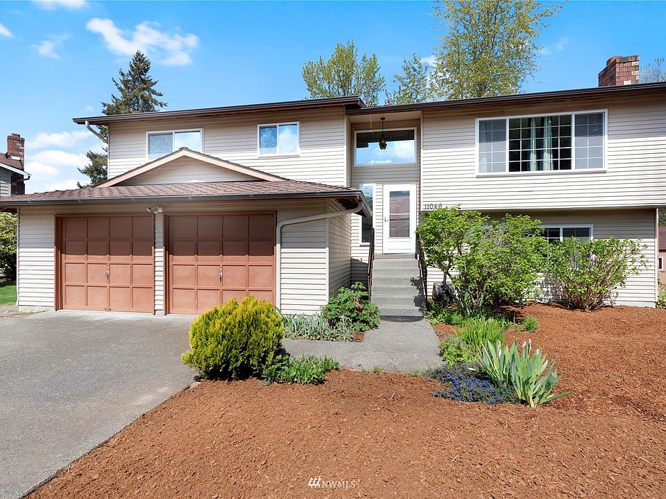 Charming 4+bedroom split-entry home on large lot. This partially updated home features SS fridge/dishwasher, new carpet, new paint & fixtures. The brightly lit rooms allow plentiful sunlight and on those dark, cold days, enjoy the cozy wood fireplace. Downstairs, you are met with a huge rec room/living area as well as a spacious 4+bedroom. Also, downstairs is a full-sized plumbed bathroom that just needs to be done to your liking. Enjoy BBQs off the large deck that overlooks the beautiful yard or perhaps add a hot tub to the covered patio below. Located on a quiet cul-de-sac & close to shopping, parks, schools & freeways for quick commuting. Central A/C! With some additional ideas, this property could shine even more than it already does!
