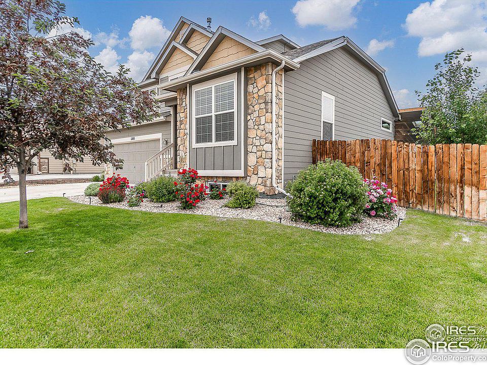 New year, New Price , New and Improved! This 4BR plus a study sits on almost 1/2 acre. You can have your very own SHOP here too! One bedroom is on the lower level with a full bathroom for an in-law or guests. Primary Bedroom plus 2 more bedrooms & the laundry room are all on upper level. The kitchen has ample cabinets and a breakfast bar that seats 4 comfortably plus an large dining area that abuts the kitchen for easy entertaining. The study can be easily converted into a 5th bedroom plus you have the unfinished basement for future expansion. The Seller has added quite a bit of awesome features to the yard. When Spring springs you will see rose bushes & fruit trees bloom like pears, plums, peaches & cherry trees that align the side yard. You will enjoy your time on the stamped concrete patio with new roof that has lighting & skylights and a built in stone outdoor fireplace with 2 grills and a fridge. This yard is huge and has a chicken coop, shed, fenced veggie garden with access to water, a fire pit area and there is plenty of room to build a shop or store vehicles like boats, RVs, trailers and large trucks. Perfect for the small biz owner that may have vehicles to store. The Tandem garage is great for that extra space! This home is located just 25 min from Fort Collins and easy drive to Greeley and Wyoming too!