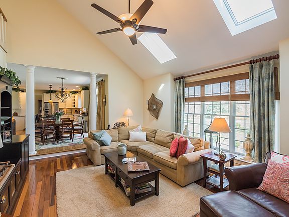 **Stucco has recently been coated and given a clean inspection report! Be sure to check out the 'other' document in forms showing all recent updates!** This elegant cul-de-sac home is definitely not to miss! The stone exterior and majestic landscape makes it a stand out. The center hall entrance gives you a perfect view of the home's main floor layout with gleaming hardwood floors. On the right side is the study/office, with built-in shelves for more storage space. On the left side is the living room with wood burning fireplace leading to the formal dining room with beautiful columns and crown molding. The gourmet kitchen has a lot to offer! It has granite counter-tops, island with pendant lighting, cook-top, pantry, and plenty of cabinets for storage. The open floor plan leads to the breakfast room and then on to the family room. The breakfast room has access to the deck and patio with a stone fire pit. The family room is a great sight, with a soaring vaulted ceiling with skylights, a stone fireplace, and a second staircase. The finished basement with recessed lighting and wall to wall carpeting is great for a recreation room. Upstairs are the bedrooms, all with carpeting, ceiling fans, double closets, and sizable windows for generous sunlight. The sizable master bed has its own sitting area and a luxurious bath. The spa-like bath on marble floors has a marvelous soaking tub and glass stall shower. It also has a huge double vanity and a built-in dresser. You will want to end each day out back either entertaining or putting up your feet! Don't miss your chance. Make your appointment now!