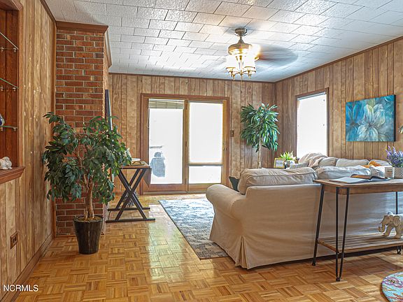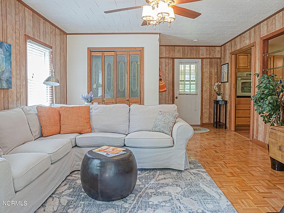 Delightful 3-bedroom, 1.5-bathroom home nestled on a spacious .34-acre lot in New Bern, NC. This property offers a perfect blend of classic 70s charm and modern upgrades, making it an ideal place to call home. As you approach this inviting home, you'll be greeted by a paved driveway, well-established flower beds, and a covered front porch—perfect for relaxing with your morning coffee or enjoying the evening breeze. Step inside to find a bright and airy living area filled with natural light flowing through large windows, an accent brick wall, original linoleum flooring, wood trim, and charming wood paneling. To the left of the living area, you'll discover a beautifully upgraded kitchen equipped with ample cabinet storage, a built-in wall oven, and matching stainless steel appliances. The adjacent formal dining area boasts a cozy brick fireplace, creating a warm and inviting atmosphere for family meals and entertaining guests. All three bedrooms are generously sized and share a full-sized bathroom. One of the bedrooms offers private access to the bathroom for added convenience. Additionally, there is a half bath located in the main living area. The screened-in back porch provides a serene space to unwind while overlooking the expansive backyard. Whether you're hosting a barbecue or simply enjoying the outdoors, this backyard offers endless possibilities for outdoor activities and gardening. Minutes to Downtown New Bern and a short drive to MCAS Cherry Point.