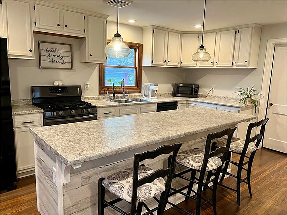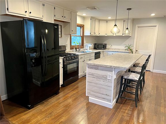 Amazing updated home with open floor plan and beautiful hardwood floors! Step into a spacious entry with a coat closet, leading to an open kitchen featuring ample storage, a large island with seating with pendant lighting, and seamless flow into the vaulted-ceiling living room. Main level offers 2 bedrooms and a stylishly updated full bath. Finished lower level boasts a large family room, new carpet, full bathroom, and laundry area with walk-out to a concrete patio and wooded backyard. Enjoy both a covered patio and a shed in the yard. Tons of storage, including a furnace room. Easy access to I-376 and Pittsburgh International Airport. Move right in!