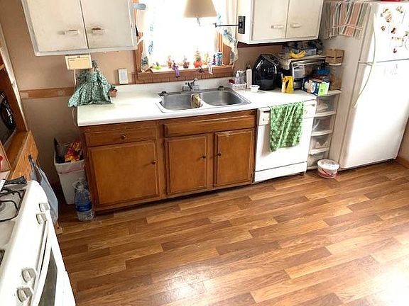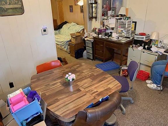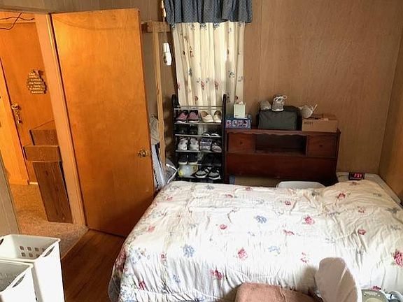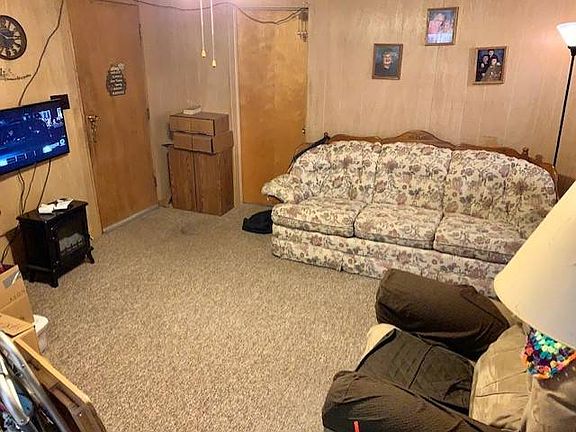 Entrance: Glass enclosed front door and handicap ramp. Living Room: Paneled walls, low nap carpet. Dining Room: Painted walls, tan carpet. Kitchen: Laminate floor, white counter top, wood cabinets, stove and refrigerator are included. Bedroom: Paneled walls, adjacent to bath. Bath: White fixtures, vinyl floor located between the 2 bedrooms. Bedroom: Paneled walls, adjacent to bath. Back porch off kitchen. Basement is a cellar type basement with outside entrance. It holds the water heater, GFA furnace and CAC. Nice carport on north side of the house. Old shed type building for garage.