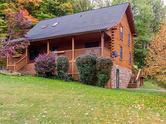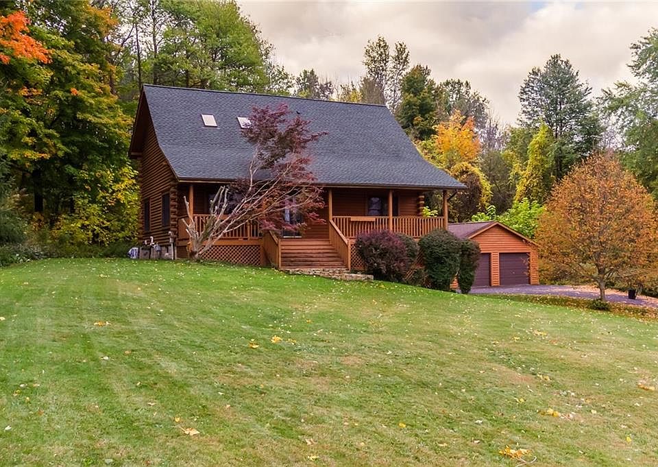 Beautiful Log Home rarely available! situated on 1.33 glorious and private acres!*From the minute you walk in you can enjoy an open and spacious feeling*Great Room with cathedral ceiling and 4 skylights... 2 skylights were replaced 3/2020*Spacious kitchen with all appliances included*!st floor master suite*Upstairs features a loft overlooking the first floor, 2 bedrooms and a bath*13 course basement walk out basement*New 35 yr high definition architectural roof 2017*Driveway installed 2018 and sealed 2019*High efficiency furnace w/media style air cleaned*Garage was built in 2002*Easy access to 390, thruway and area shopping*Time to sit on the front porch and enjoy the spectacular long range views!!
