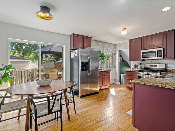 Welcome to this beautifully remodeled tri-level home, showcasing quality craftsmanship and custom details throughout! Every inch of this 3-bedroom, 2-bath residence has been thoughtfully updated inside and out. The main level features a stunning open-concept kitchen with recently painted 42" cabinets, a new tile backsplash, granite countertops, stainless steel appliances, a double sink, and seamless flow into the dining area with sliding doors leading to an oversized deck and patio-perfect for outdoor entertaining. The sun-filled living room boasts gleaming hardwood floors and a large picture window. Both bathrooms have been fully remodeled with custom tile mosaics, a deep soaker tub, double sinks, and stylish LED lighting. Upstairs you'll find three spacious bedrooms with all new carpeting, while the lower level offers a cozy family room with wainscoting, and new carpeting. A freshly painted interior, new appliances, new dryer, and a new hot water heater make this home truly move-in ready. An oversized utility room provides ample storage space. Exterior updates include a new roof (2022), soffits, gutters, vinyl siding (2017), and energy-efficient windows (2017). The large, fenced-in yard is beautifully landscaped with mature trees. Conveniently located near award-winning schools, parks, shopping, expressways, and more-with two parks just one block away.