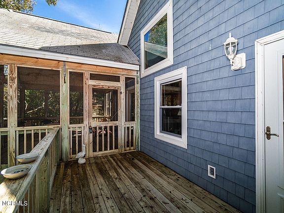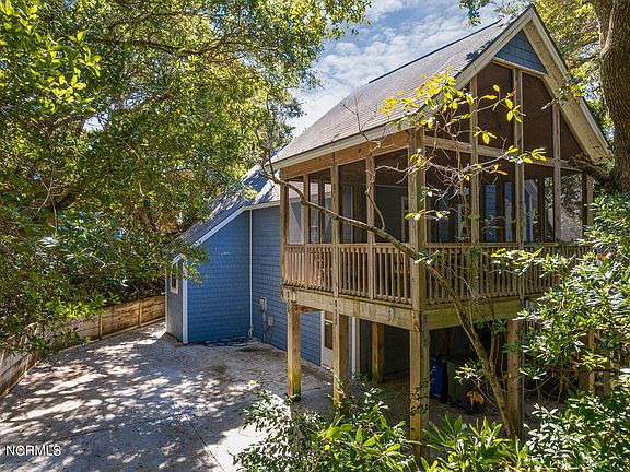 Offered BELOW appraised value! Nestled within Emerald Isle's live oak maritime forest, this Timber Trail gem, boasting an additional 958 sq ft downstairs, marries serenity with convenience in a sublime setting. The standout 16x16 screen porch, overlooking the maritime forest, embodies outdoor livings finest, featuring high-end screening, ''taxi cab lights,'' and a ''beer railing'' for entertaining. Positioned well above the flood plain, the absence of HOA fees and lawn maintenance epitomizes carefree coastal living. The home offers unparalleled Bogue Sound and ocean access, with a remarkably short walk to the beach. Live oaks provide natural hurricane protection and noise reduction, enhancing tranquility. The driveway hints at the low-maintenance ethos, with potential for a carport under the screen porch. Inside, the high-quality vinyl siding reflects the meticulous craftsmanship evident throughout. The main floor and loft feature solid pine planking and oak kitchen cabinets, while the detailed tile work and solid countertops underscore the home's elegance. The newly expanded ground floor offers versatile living space, ideal for a variety of uses from a guest suite to a workshop, emphasizing the property's thoughtful layout. This home is a blend of nature, comfort, and practical luxury, offering a lifestyle where tranquility meets convenience. At 1105 Timber Trail, life's best moments await in a community that values privacy and peace, all within the vibrant embrace of Emerald Isle.
