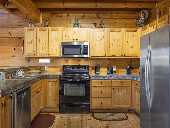 Beautiful log cabin in a well maintained resort that features a swimming pool and a zip line. Open floor plan with newly refinished hardwood floors on the main and downstairs levels. Two heat and air units with the main level unit new in 2019. Custom concrete kitchen countertops with stainless steel appliances and a new microwave. All wood interior. Two hot water heaters. The cabin was stained in 2018. Three level cabin with two master suites with whirlpool tubs in addition to a third bedroom. Far enough away from all the hustle and bustle, but close enough to be only minutes from area attractions. Sold furnished. Per owner, the cabin grossed almost $67,000 for 2019.