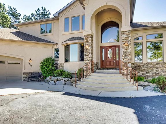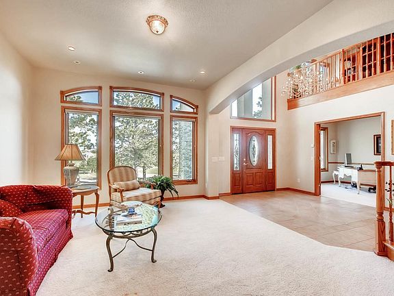 Easy I 25 access to Denver & Colorado Springs. Impressive custom home on large, private lot with view of the King's Deer Golf Course. From the dramatic entrance you can either enter a bookshelf lined, private office or step into the elegant, formal living room. The inviting dining room is in close proximity to the gourmet kitchen that is a cook's delight. Cherry wood cabinets are complemented by extensive, lustrous granite counter tops. From the sunny breakfast nook you can walk out onto the covered deck or enjoy the two story family room with a large wall of windows and fireplace. The main level master suite with two sided fireplace encompasses a huge walk in closet and luxurious bath.All bedrooms have a private bath. The lower level houses a theater room, exercise room, sauna, and large game room with bar. The home has an attached 4 car garage plus a separate building with motor home storage and easily accommodates 3 additional cars. 11 zone hot water in floor heat, Small Duct High Velocity A/C System.