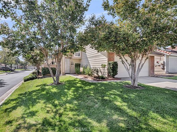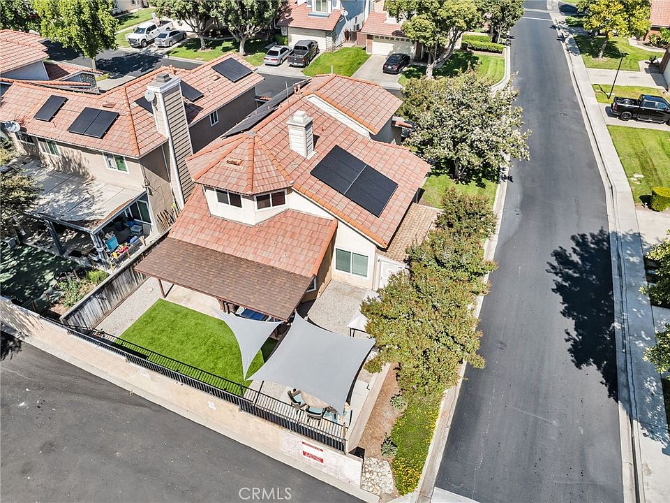 Solar, Corner Lot, Low Taxes and Upgraded make this Home very affordable. This home in Andover Square Community of Rialto is Move in Ready. The corner lot location with no adjacent rear neighbors provides additional privacy. Upon arrival the beautiful herringbone brick accents along with the lush landscaping will welcome you in. The living room has cathedral ceilings, a cozy fireplace and an abundance of natural lights that cascades throughout the room from the multiple windows. There is a formal dining alcove or currently used as the piano area adjacent to the living room. The kitchen has been remodeled with stainless steel appliances, upgraded warm cherry stain cabinets and stone counter tops. The dining area that is connected to the kitchen is spacious and looks out onto the rear patio. The laundry area is conveniently located near the kitchen and downstair bathroom. Upstairs there are 2 large additional bedrooms, a full bathroom and the primary suite. The primary suite is located towards the rear of the home adding to its privacy. The primary has 2 closets and its own private bathroom; this is the perfect sanctuary you have been searching for. The decorator paint colors and upgraded flooring add to the overall modern feel this home offers. Along with the decorator touches, remodeled kitchen and baths the upgrades also include a newer HVAC. The rear yard has a covered patio, artificial turf and has been thoughtfully designed for low maitenance and entertaining in mind. The shed is completely finished with drywall on the interior and has electrical outlets and lights, making it a perfect art studio or office space. This wonderful neighborhood offers 2 pools, sport courts, walking paths and plenty of green space, it feels like a resort. This home has solar along with low taxes adding to its overall affordability. Located near schools, shopping, restaurants and easy access to freeways for commuters.