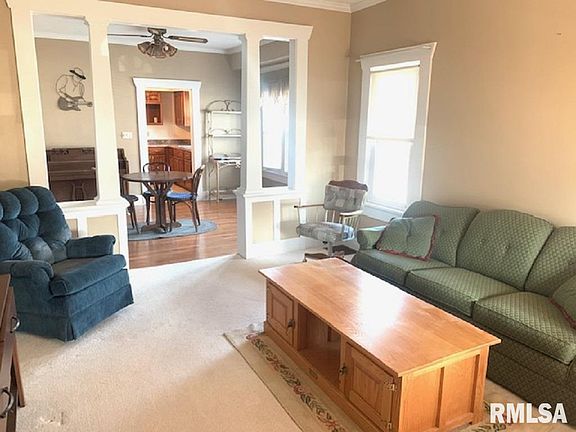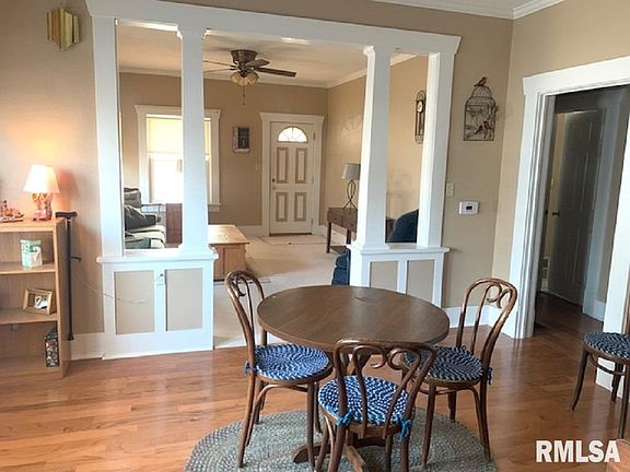 Attractive Bungalow on west end of town. Inviting front porch. Attractive columns separate the living/dining room, crown molding through most of the house. Kitchen has plenty of cabinets, breakfast bar and room for informal dining. Replacement windows. Master bedroom has adjoining room for small tv room or office. Total of two bathrooms...one is in basement adjoining room with large closet and room that has been finished off for office, 3rd bedroom, etc. Basement also has an extra kitchen. Plenty of great storage. Home also has a nice deck off back and 2.5 car garage.
