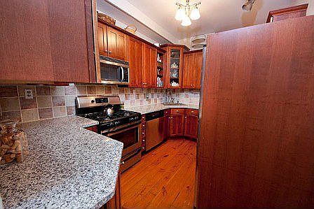 A renovated Classic! Beautiful 1500 Sqft, 2BR+den/office w/2 full baths. Old world charm w/renovated granite kitchen w/ss appl. & custom cabinets. Remodeled baths w/dbl pedestal sinks, stand up shower and tumble marble. Lrg LR w/formal DR w wainscoting & chair rail, china closet & French doors. High ceilings, HWF's thru out, window AC's & W/D in unit. 8 unit building w/extra private storage, common yard & 3 months parking included. Steps to all NYC trans, shops & restaurants.