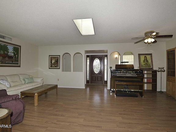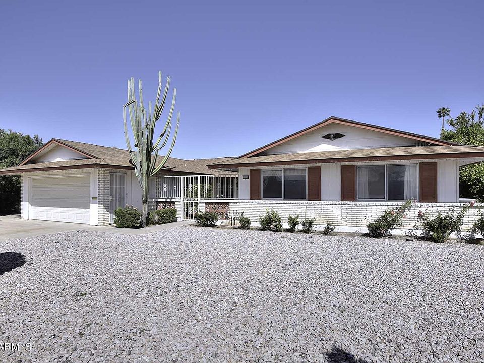 Do not miss your opportunity to own this lovely sun city home. Gated courtyard entrance leads you to a formal living room with arched cut out details. This room flows seamlessly to the family room with a wall of windows overlooking the back yard. Large Formal dining room adjacent to the kitchen where you will find plenty of cabinet and counter space and a good space for a breakfast table. Nice sized master bedroom with en suite bath where you will find a terrific vanity table. 2 additional bedroom and an inside laundry complete this charming home. Large covered patio with great fruit trees for shade! Low maintenance desert landscaping through out property. Come take a look!!
