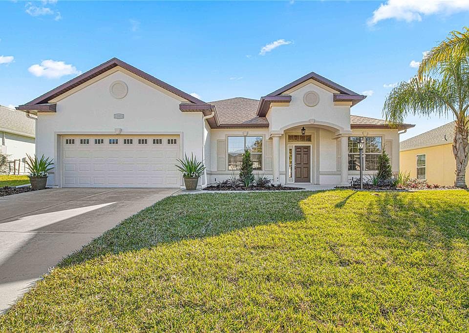 THIS STUNNING 2014 HOME IS LIKE NEW AND LOCATED IN THE NEWEST AREA IN BEAUTIFUL STONECREST, a 55+ golf community where all of the amazing amenities are just a quick golf-cart trip away. Situated adjacent to the Villages, this much sought after community features 4 Pools, fitness centers, championship golf course and a country club restaurants just to name a few. Built in 2014, this home is 2,378 sq ft, boasting a well designed and spacious interior space with a open floor plan, ideally suited for entertaining. This home is the popular Frontier Model, a 3/2 PLUS large den with soaring 10 ft ceilings with many upgrades throughout. Upgrades include new luxury vinyl extended plank flooring, 6" baseboards and crown molding in every room. For entertaining, the built in mini bar and a glass-enclosed, spacious lanai are perfect for friendly get-togethers. The lanai is plumbed and ready for the outdoor kitchen of you dreams. You'll be amazed by the gourmet kitchen with immaculate solid wood cabinets and self-closing drawers with pull-out shelving and island with all NEW stainless appliances-Convection oven with air fryer. The large master bedroom features an oversized walk-in closet and a door that opens up to the large lanai. The master bath has an enormous walk-in shower with a bench, dual sinks and a heart shaped soaking tub. This serene and quiet community is located in beautiful central Florida, approximate one hour drive to Orlando and Disney, the famous Florida beaches and local eateries and entertainment. Schedule a showing today and experience everything this home has to offer.