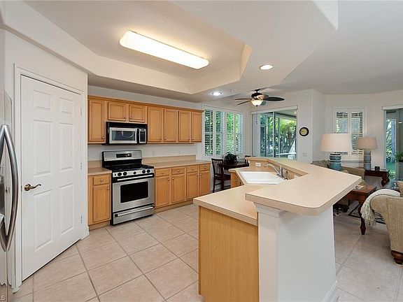 Welcome is what this property says! In a great location, directly across the street from the community pool and lots of 'green space' outside the lanai. 3 Bedrooms with 2 baths, tile in main living areas including lanai, carpet in bedrooms. Natural gas for cooking, light wood cabinets, chair rail in dining areas, newer AC compressor, upgraded fans/fixtures throughout; comfort height cabinets with large walk-in shower in the Master. Protected with storm screens on the lanai to let light in as well as offer hurricane protection, furniture negotiable, occupancy March 1 or after. 186 slip deep water Marina with slips available for lease or purchase. Some amenities herein available but not offered. Sq. Ft. approximate or from Lee Co. Master Association Fee: $1350/Annually, Condo Fee $592 monthly.