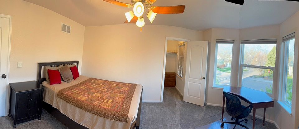Blazing Maple - A sun-drenched retreat that perfectly balances comfort and charm. Bathed in natural light from a generous bay window, this serene bedroom feels bright and airy from the moment you walk in. A sleek ceiling fan with a soft overhead light casts a gentle glow in the evenings, adding both style and comfort. The queen-size bed sits as a cozy centerpiece, inviting you to relax and unwind, while a thoughtfully placed desk offers a quiet nook for reading, writing, or working from home. Generous walk in closet too. Lovely home in Longmont, Boulder County. 4100 square feet. Furnished bedrooms; most bedrooms have walk in closets, bed sizes full or larger rooms have combination locks on each door. Soaring ceiling in the living room, home theater and pool table in the basement, kitchen complete with kitchen toys galore, everyone has assigned shelves, and vegetable gardens in the backyard to enjoy. Housekeeper cleans once per week and gardener comes during the growing season once per week. Close proximity to UC Health Longs Peak Hospital, and CommonSpirit Longmont United Hospital. Allergy friendly home; smokers, animals and drugs NOT permitted. Treelined, charming neighborhoods around Longmont particularly areas close to Trail Ridge Middle School and downtown. Explore the best spots that balance greenery, walkability, and access to restaurants and shopping. Only a couple hours to skiing resorts and hiking in the majestic Rocky Mountains. Allergy free home. No pets, smokers, vaping, etc. 1 Year lease is typical, but arrangements can be made for travelling jobs.