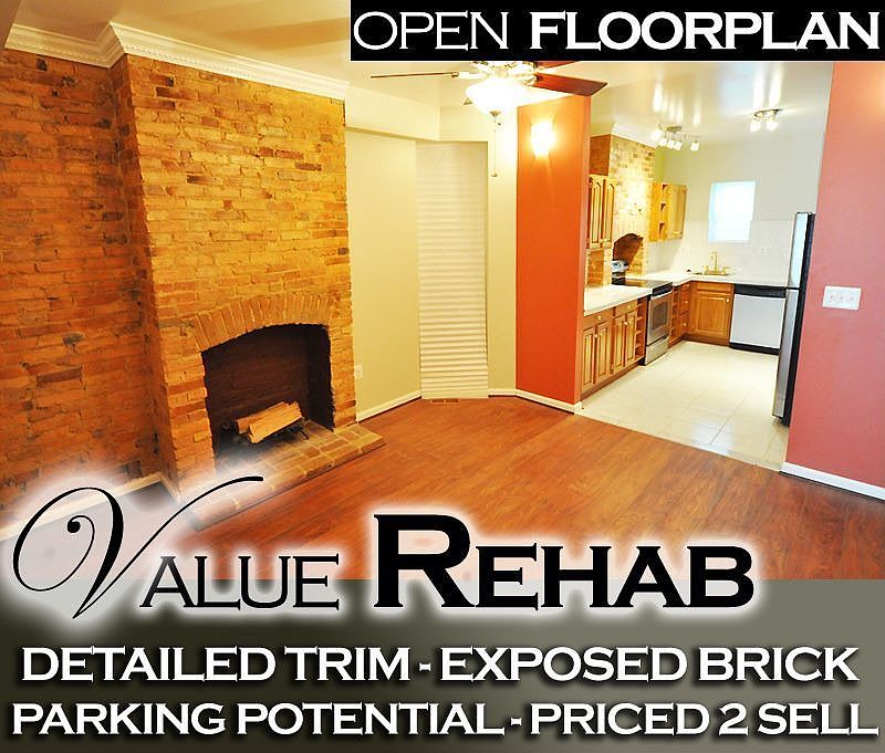 VALUE REHAB WITH AN OPEN FLOORPLAN, DETAILED TRIM & EXPOSED BRICK! This 2 story home features an open floorplan with 3 bdrms w/ carpet, 1.5 baths w/ ceramic tile & skylight, crown molding, exposed brick, laminate wood flrs, 3 decorative fireplaces, ceiling fans in LR & DR, Kitchen has silver appliances w/ d/w, GE Profile fridge, electric stove & ceramic tile, backyard has potential for parking!