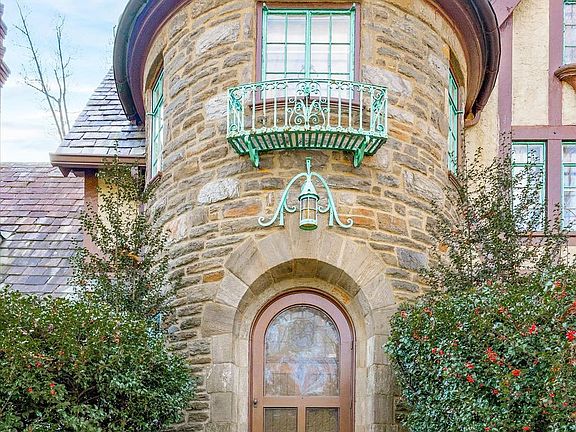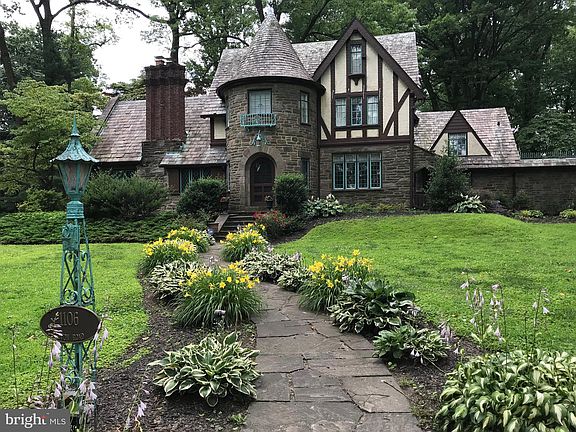 Located on a quiet street in the prestigious Rydal neighborhood, this elegant 1930’s Tudor, built for the Ortlieb Beer family, has been restored to its original splendor of elegant craftsmanship and architectural designs. Situated on .9 acres, this 4 bed, 3/2 bath home with 5 garage bays and slate roof, sits on a corner lot with mature, professional landscaping and has been meticulously maintained over the years. The property includes an exterior garage building, constructed in 2015, which can accommodate multiple vehicles or house a potential home office, gym, man-cave/she-shed; the possibilities are endless. Step into the residence through the refinished arched door with unique stained-glass windows to a welcoming and elegant foyer, featuring a curved staircase with intricate carved wood, wrought-iron spindles and arched doorways, setting the tone for this stunning home. A charming powder room with a custom crystal lighting fixture, art-deco tile floor, and a large storage closet is located under the staircase. The heart of the home is the living room, adorned with original dark wood floors, a beamed cathedral ceiling, a Juliet balcony, a stone gas fireplace with an ornate wood mantle, oversized windows with leaded stained glass, built-in bookcases, and an original window reading nook—a perfect setting for entertaining during holiday parties or enjoying a quiet moment with a good book. The adjacent den, with walls of windows and down lighting, overlooks the lush backyard landscaping and features stone arched walls and a pellet stove. The dining room, bathed in amazing sun-drenched lighting, showcases decorative wallpaper, chair rail molding décor, a crystal chandelier, hardwood flooring, and insulated stained-glass windows, that reflects the art-deco style of the home. The breakfast room and kitchen have been completely remodeled with tile floor, and cherry (Omega) kitchen cabinets with egg and dart trim, crown moldings and oil rubbed bronze hardware, upgraded KitchenAid appliances, stainless-steel sink with HansGrohe faucet and an original chandelier, that has been professionally refurbished & dates back to the construction of the home. Self-closing drawers with custom inserts and a built-in pantry have been thoughtfully designed to maximize the functionality of this space. The kitchen countertop is maintenance-free quartz, and the same quartz countertop has been carried into the entry/mudroom and the adjacent breakfast room window shelves. The mudroom features convenient main floor laundry, access to the flagstone slate patio, driveway, and garages. Upstairs, the main bedroom impresses with its generous size, multiple closets, and an ensuite bath adorned with original vitreous glass tile. The 2nd bedroom, also sizable, features a closet, access to the Juliet balcony and a Jack n Jill bathroom with hallway access. The 3rd and 4th bedrooms, currently utilized as a home office and closet, enjoy great lighting, hardwood floors, and access to an additional full bath. The 3rd-floor attic awaits the potential to be finished into a bonus room with great natural light and a cedar closet. Descending to the basement reveals a finished space with a bathroom, ample storage space, and the utility room. Additional amenities of the home include a Buderus stainless steel computerized gas hot-water boiler system (2019), 50-gallon gas hot water heater, high velocity air conditioning, generator, hard-wired security system, Ring cameras, attic cedar closet and swing set. This residence seamlessly combines timeless charm with modern conveniences, making it a truly exceptional living space.