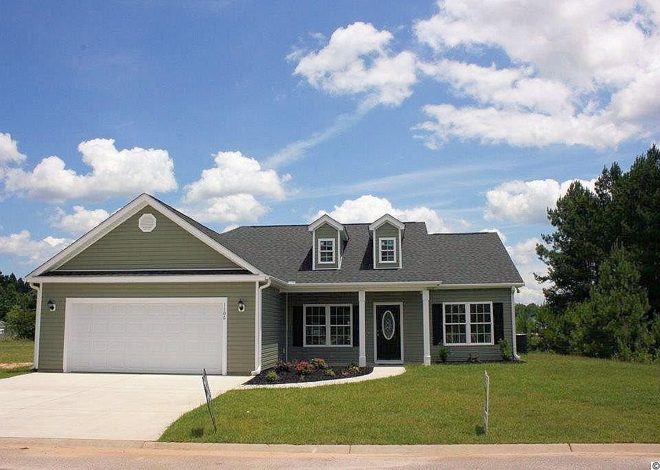Popular Hickory 70 with open floor plan, split bedrooms, large relaxing front porch. Entry foyer with hardwood floors, dining room has tray ceiling and arched wall openings. Spacious kitchen has wrap around breakfast counter, breakfast nook, lots of counter top space and solid wood cabinets with crown molding and knobs, stainless steel appliances. Private 12' x 14' Master suite with vaulted ceiling, ceiling fan w/light, huge L shaped walk-in closet, two sinks, raised height vanity, garden tub with obscure privacy window to let light in, plus a separate walk-in shower. Rear screened porch and concrete patio. Smooth ceilings, 30 year roof shingles, cottage style doors, gutters, sodded yard, fully finished 21' x 24' garage with automatic door opener, pull down stairs to attic storage, and irrigation system. Gated community, pool and clubhouse. Close to North Myrtle Beach, shopping, dining, etc. Photos and video are for illustrative purposes only and may be of similar home built elsewhere. Square footage is approximate and not guaranteed. Buyer is responsible for verification.