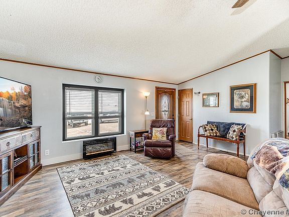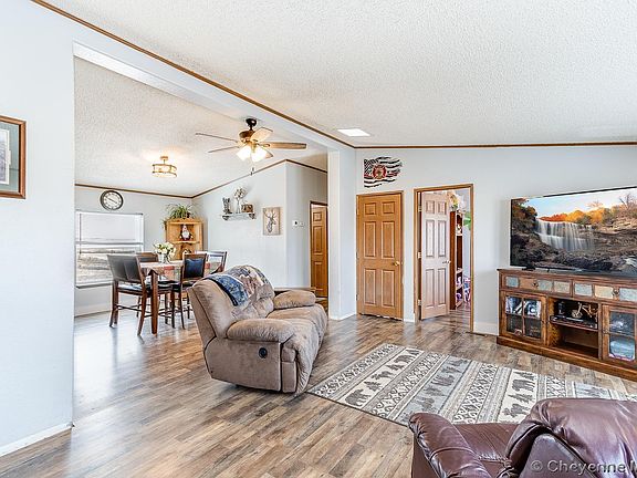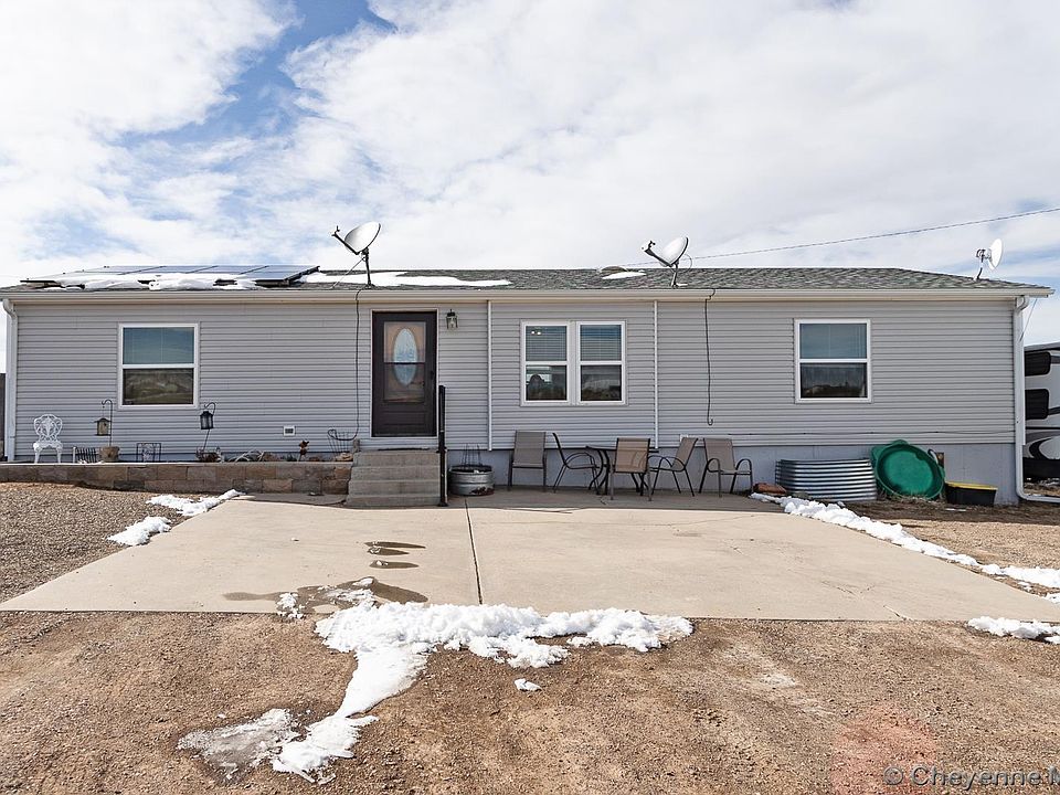 Only 9 miles to Curt Gowdy State Park and just in time for all your summer activities! Newly renovated manufactured home on 5.95 acres. This 3/2/2 has an unfinished basement with a 3rd bath roughed in & 3 over-sized egress windows to finish out however you wish. New furnace, central A/C, refrigerator, & SOLAR PANELS in 2021. New vinyl siding, vinyl windows, roof, gutters, flooring & 2 car garage in 2022. 40+ trees on drip system. Acreage completely fenced with 2 pastures cross fenced. Pellet stove in basement, 500-gallon propane tank & swing set included.