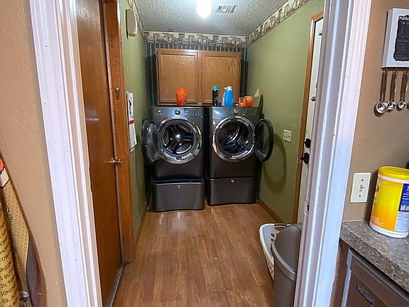 Open living, dining and kitchen has granite countertops with wood top bar area. Wooden laminate flooring with carpeting in bedrooms. House sits in center +/- of lot.