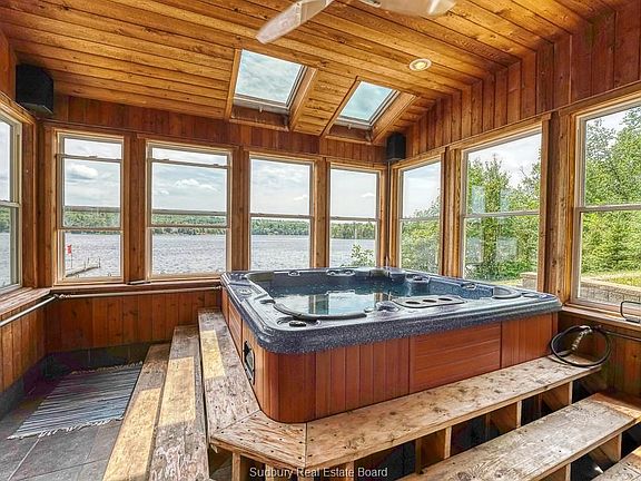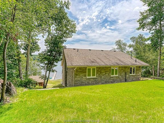Lake Life truly is the best life! This absolutely stunning one acre Long Lake property has an incredible 150 foot water front with a beautiful southern exposure that is spectacular. Pride of ownership and superior workmanship are evident in this lovely stone/wood over 3000sq foot home that is a dream. With its numerous large windows showcasing the beauties of our northern Ontario 4 seasons, this home is immaculate inside. The beautiful sunroom off the kitchen awaits you and friends to enjoy a morning coffee or evening glass of wine, while the large family room with in floor heating, wood burning stove, beautiful bar and incredible view provides a place for family and friends. Imagine enjoying this large beautiful hot tub room, surrounded by windows to take in the view of the lake, but privacy is provided by the many trees surrounding the property. This beautifully built home boasts attention to detail, like the Invisirail decking rail showing no posts, only clear glass to take in all the landscape of this beautiful Long Lake property. The home is finished in a lovely stone with wood accent, aesthetically fitting in beautifully to its surroundings. A boathouse by the shore could also be used as a workout room, home office, or guestroom. The property also has a beautifully built sauna, with a wood storage area attached to it for easy access. To complete the full compliment of outbuildings there is a large double detached garage. This spectacular property provides amazing privacy, abutting to crown land, and is only 20 minutes to the South End of Sudbury. This truly is a home that has everything to offer!