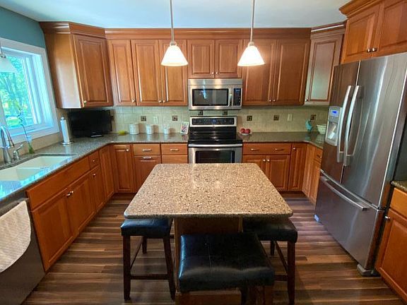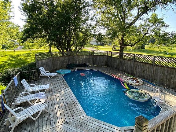 Lots of updated to the two story home that is perfect for entertaining and family fun! Grill out on the second level of the deck overlooking the heated above ground pool or enjoy the private hot tub located on the patio just outside the walk-out basement. There is a four season room to sit and enjoy sunny days in the comfort of your home. Main level features updated kitchen with beautiful cortez countertops, engineered hardwood floor, center island and maple cabinets all designed by American Home Design in 2013. Formal dinning room just off kitchen, family room with fireplace and formal family room all on the main level gives your family lots of room to spread out. Second level features bathroom with jetted tub and three large bedrooms. 4th bedroom is smaller, perfect for an office, nursery or craft/sewing room and large hallway with built in storage is perfect bonus area for a toy room. Large wooded lot provides lots of shade to enjoy all the outdoor activities.