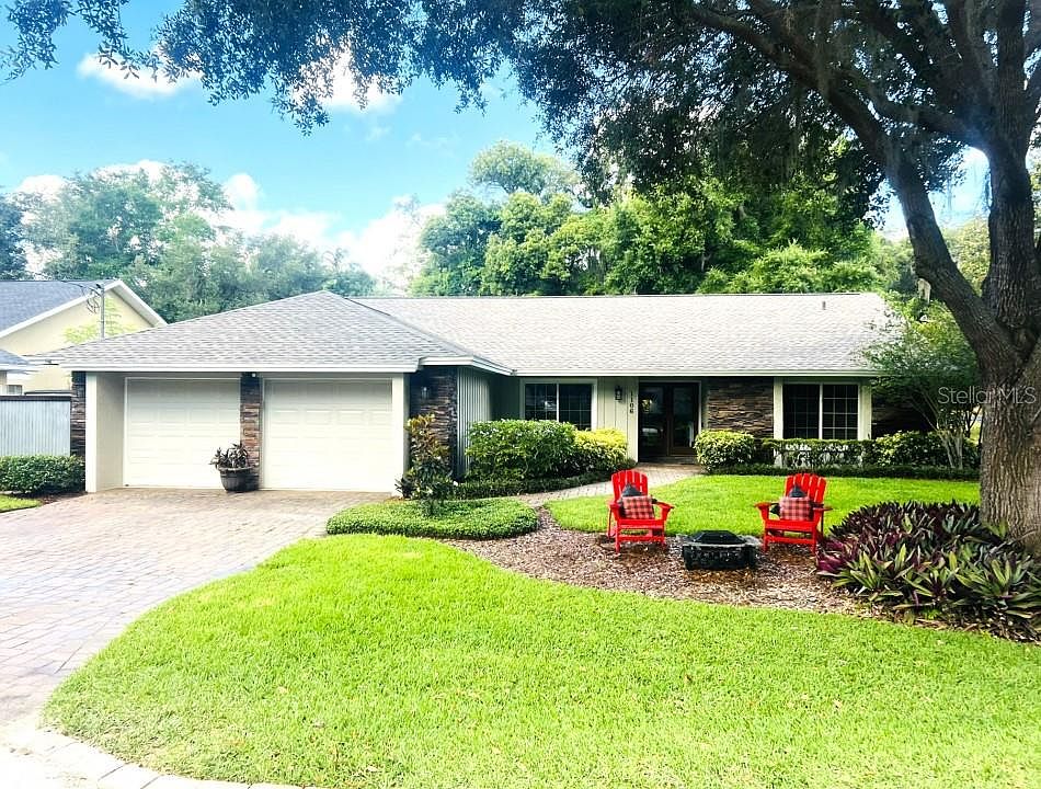 New roof installed on 5/1/24 with a 25 year transferable warranty. This updated ranch is on a peaceful oak lined street in beautiful downtown Windermere. The large master bedroom is on the left and the additional bedrooms are on the right. Between them you will find a generous size family room with vaulted ceilings and a wood burning fire place as well as a spacious formal dining area. The kitchen features all stainless Kitchen-Aid appliances and plenty of counter space (Quartz) as well as a large pantry and breakfast area. The heart of this home however is the outdoor living area which can be accessed by a pair of double sliding doors. At 45' X 15' there is plenty of space to overlook the 36' pool, jacuzzi, and lanai. The ceiling is tongue and groove and the entire outside area has retractable shades from floor to ceiling. As an added bonus there is a charming 150 square foot storage building on the rear of the property as well as another 15' X 15' outdoor living area with pavers. A unique feature of this home is that part of the garage has been converted to an 150 square foot office that is perfect for those who work from home. The office takes up less than half of the garage leaving plenty of space for a vehicle plus a golf cart. Don't need an office? This space could easily be converted back to accommodate a second vehicle.