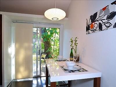 Beautifully appointed with custom walnut cabinetry, stained concrete floors, stainless appliances, and modern, cozy furnishings.