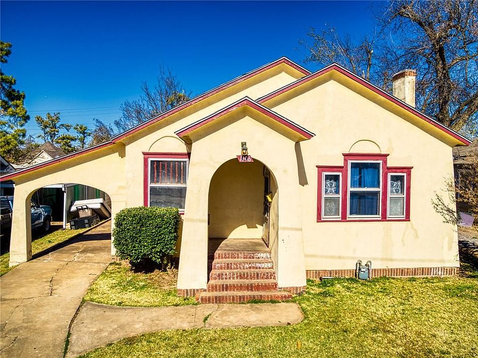 El Reno Oklahoma...Just West of OKC Metro...Beautiful Inside & Outside Built in 1929 Home... Surprised it is not classified Historical... Nice Curb Appeal with Covered Front Porch with a 2 Owner Remodeled home with 1008 S/F with Large 15x15 Living Room w 9' Ceiling with newer Wood Look Mold Free Vinyl Flooring, Sconce Lighting, Masonry Fireplace, Crown Molding, 8" Base Boards, and 5 Windows to let the natural Lighting in. Arched Doorway leading into the Spacious 11' x 12' Dining with Plenty of Space for Large Dining Table and China Cabinet, Crown Molding & 3 Lg Windows for plenty of lighting. Spacious Kitchen with Crown Molding, Newer Stainless Duel Sinks, Oak Cabinets, Counter-tops, Ceramic Back Slash, Microwave, Dishwasher, Disposal. Going Down the Stairs from the Kitchen in to the 13' x 19' Basement with Washer and Dryer Hookups and a Built-in Cabinet with 4 Drawers. Good place to go in case of Tornado. Large Fenced Backyard with Back Yard Access. EZY to See. Verify Elementary.