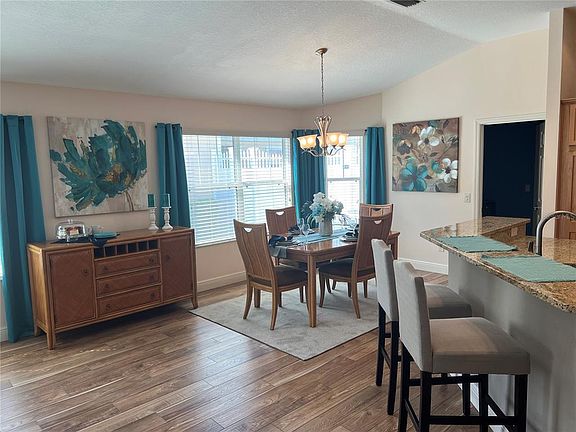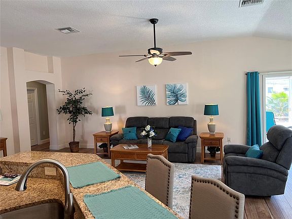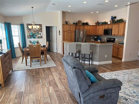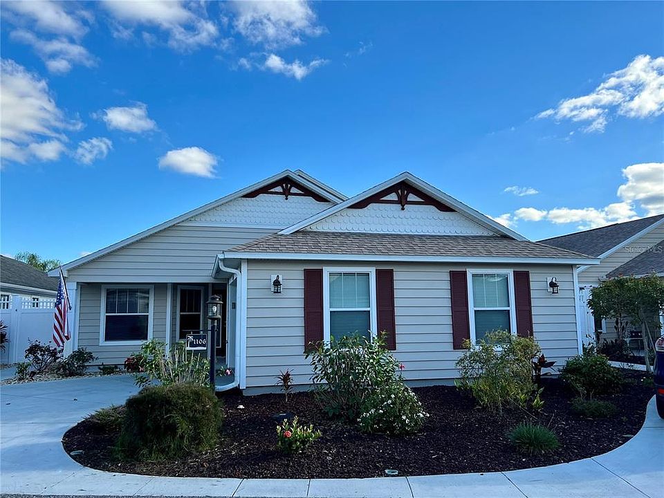 Fantastic 3/2 courtyard villa located in the highly desirable Creekside Landing near Lake Sumter Landing in the village of Bridgeport. The highly sought after Cumberland floor plan features large OPEN KITCHEN with granite tops, VAULTED CEILINGS throughout, INSIDE LAUNDRY and PRIVATE Master En Suite. Living, dining and bedrooms include luxury laminate plank flooring. Master Bathroom has been updated with tile, granite tops and frameless shower door. Master Closet is upgraded to include shelving, drawers and hanging fixtures. This home is beautifully landscaped and provides plenty of ROOM FOR A POOL. Meticulously cared for, this home has great curb appeal including landscaping with rock beds, shrubs, pergola and flowers. Conveniently located near Sumter Landing which features beautiful water views, incredible live music, dining, shopping and more. Creekside community features swimming pool and nearby pickleball courts and golf courses. Roof replaced in 2020. Furniture available. All measurements are approximate.