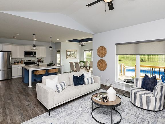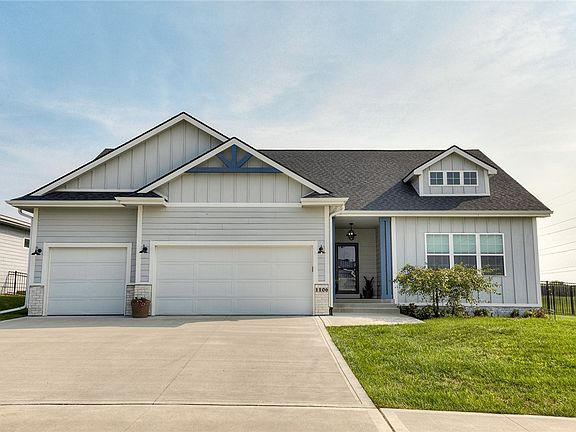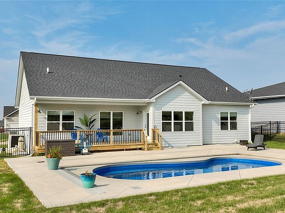 Make your dreams come true with this turn-key, farmhouse-styled ranch backing to a golf course with a gorgeous in-ground pool! The main floor offers an open concept, vaulted ceiling. The kitchen offers white cabinetry and white quartz counters and a darling blue, over-sized island. There are two secondary bedrooms and full bath on the main along with a master suite with walk-in closet and tiled shower. A mud/laundry room leads to a 3-car garage with coated flooring and wall storage. The lower level has a large family room with wet bar and counter, a fourth bedroom, full bath and ample storage. Outside, fall in love with the heated salt water pool with automated cover, partially covered porch for sun or privacy and the fully fenced yard. Great views of Warrior Run Golf Course and easy proximity to the Des Moines Metro being 2¼ miles from the Highway 5 bypass, 8 miles from downtown Des Moines and 10 miles to Mills Civic Parkway in West Des Moines.