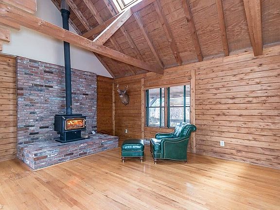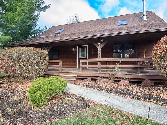 This unique log home sits on over 2 picturesque acres! Enjoy views from the newer massive stone patio and stone fire pit area overlooking the beautiful pond. A 24x32 cemented pole barn with water, electric and wood burner adds to this rare find. Many UPDATES inside this 3 bedroom 2 bath Cape Cod, including Master bath, kitchen slider, flooring, hot water tank, electrical panel, well pump, fence and split system A/C. Living room has wood burner w/cathedral ceilings. Loft overlooks living room and leads to the master bedroom and updated bath with walk-in shower. Family rec room in basement. This home is a must see!