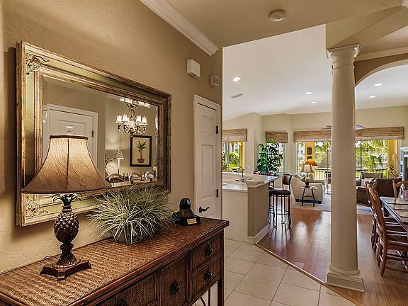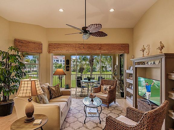 One of a kind! This is not your typical Mariposa floor plan located in Gulf Harbour Yacht & Country Club. This unique second floor unit features 3 bedrooms + Den, 3 and ½ baths, a large, screened lanai and two car garage. This spectacular home offers more than 2300 sq.ft. with 16’ ceilings, bamboo flooring in great room, tile on a diagonal in kitchen and hallways and carpet in the bedrooms and den. This light and open floor plan is perfect for entertaining with priceless views overlooking the 16th green. The wrap around lanai gives you access to the main bedroom with tray ceilings, a large walk-in closet and large main bathroom that features a corner jetted tub. The split floor plan also offers a den with custom cabinetry and desk with a ½ bath attached, a second guest suite with its own full bath, and the third bedroom is located across from the third full bathroom. Conveniently located across from the community pool, this home has everything you need to enjoy the resort lifestyle in sunny, Southwest Florida.
