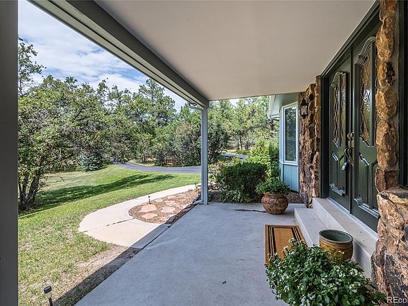 7 1/2 acres of wilderness 10 minutes from town! A perfect living space with rare adjudicated water rights. Enjoy watching the diverse wildlife from your spacious front porch and back covered patio or the side deck off the Primary and Guest Bedroom. The backyard is magical with heavily treed tall ponderosas, grass area landscape, garden area, and water feature. The entire property is fenced including a shaded dog run. The impressive entrance opens to a spacious family room with a cozy fireplace and a formal dining room. The home also features another family room/den with built-in cabinets. The kitchen has designer-painted cabinets, a double oven, cooktop/hood, and a brand new stainless refrigerator and kitchen nook. The large freshly painted Primary Bedroom features sliding glass doors that lead to the side deck. Gorgeous remodeled primary bathroom with spacious walk-in shower and plenty of natural light. Oversized 2-car attached garage with convenient service door. Incredible location! You get the best of both worlds. County living and only 10 minutes to Parker or Elizabeth and approx 20 minutes to Castle Rock outlets or Southlands Mall.