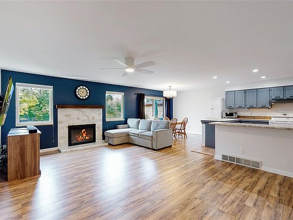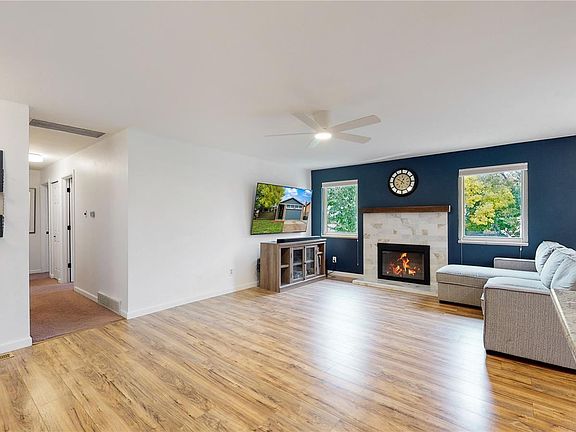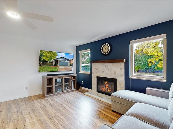 Opportunity to own one of the finest ranch style homes in the neighborhood! This home has it all. Backs to green belt. Open floor plan. Save on utilities. Solar power, owned, not leased! Spacious living room with fireplace. Recessed kitchen lighting. All kitchen appliances included. Breakfast nook and adjacent dining room. Durable laminate flooring. Walk-in closets. Amazing secondary basement living area! Large family room with kitchenette. Lots of cabinets and eating space. Second pantry, full size laundry hookups. Both basement bedrooms have egress windows. 220v 50amp service in the insulated garage. Great for Electric vehicle charging.Ring doorbell and security cameras included. This property will not last, make your offer today!