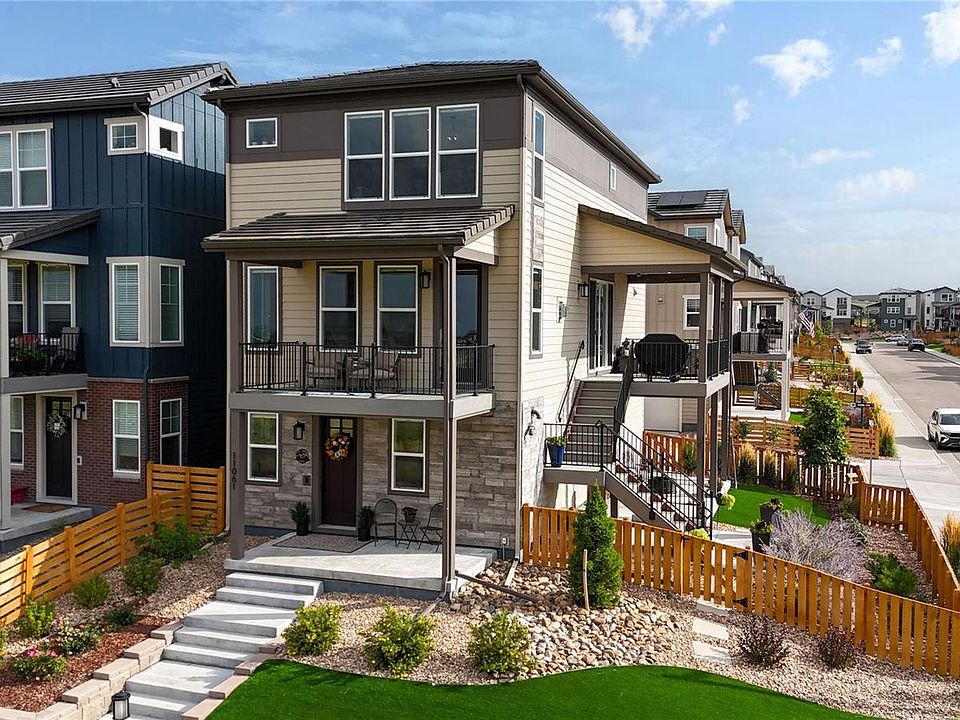 Welcome to this better-than-new home in the desirable community of Stepping Stone. Convenience and modern amenities abound in this fully upgraded 3-story property. Boasting 3 bedrooms and 3 bathrooms across 2,259 square feet, it is designed to offer both luxury and functionality. High ceilings and abundant windows provide ample natural light throughout the home to create a bright and airy feel. Upon entry, you will be greeted with a spacious mudroom to drop your belongings and prep for playtime with pets and loved ones. The main level provides an open floor plan with engineered wood floors throughout. The cozy living area has an upgraded gas fireplace with a floor-to-ceiling tiled mantle, and grants access to the upgraded covered front deck. Adjacent to the living space is the dining area which provides access to the upgraded covered side deck. The kitchen is a true chef's delight with upgraded countertops and backsplash, a large kitchen island, a walk-in pantry, and KitchenAid appliances with a gas range. Upstairs, 2 light-filled bedrooms are perfect for family, guests, or office space. The primary suite is a private retreat with a large walk-in closet, high ceilings, ample windows, and a luxurious en-suite bath with a large walk-in shower. The property is equipped with advanced smart-home features including lighting, climate control, and a video doorbell to provide modern convenience and security. Outside on the ground level, there is an additional secluded patio and yard which is perfect for pets or to enjoy the Colorado evenings. The large corner lot grants privacy and is tastefully xeriscaped to further enhance the ease of maintenance. The attached 3-car garage allows for plenty of room for vehicles and storage. The Stepping Stone community features a fantastic community pool and clubhouse, convenient access to walking and hiking trails, Hess Incline, a dog park, local parks, and a short commute to the DTC, DIA, Denver, and everything Colorado has to offer!
