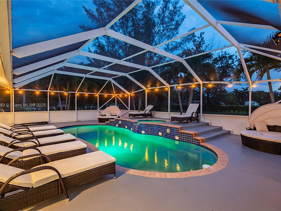 Sparkling poolOpen living spacesModern kitchenScreened patioExpansive yard