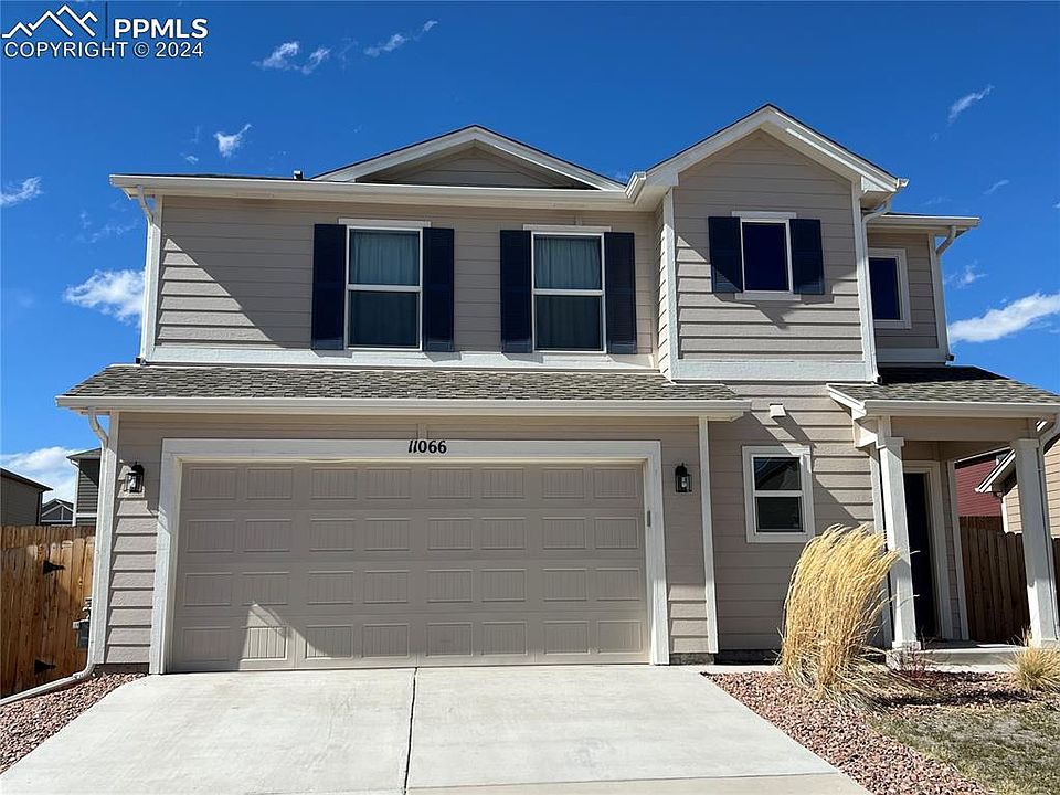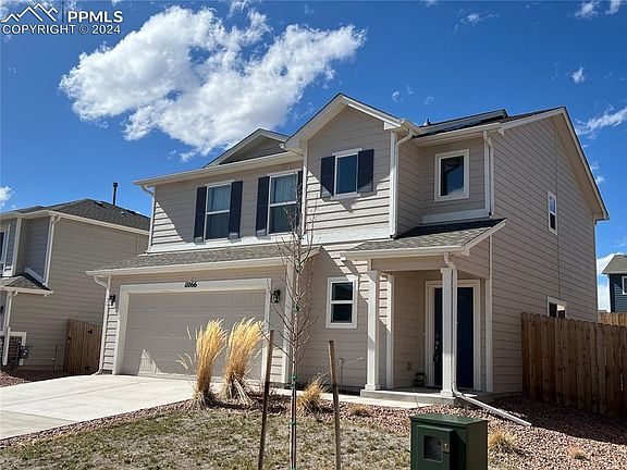 Welcome to this beautiful three-year-old Challenger home located in a desirable neighborhood with mountain views from the backyard and the neighborhood. This well-proportioned house features three bedrooms, 2.5 bathrooms, and a warm, inviting interior. The main level boasts an open floor plan with a generous kitchen, complete with stainless steel appliances. The living room is perfect for entertaining guests or relaxing by the cozy fireplace. Check out the amazing storage on the main level! Upstairs, you will find a spacious primary suite with a walk-in closet, a bonus nook, and en-suite bathroom with a soaking tub. Two more airy bedrooms, another bathroom and a laundry room complete the upper level. 50 gallon water heater ensures plenty of hot water, and efficient furnace and central air conditioning keep the home very comfortable! Residents of this community also have access to a neighborhood pool and clubhouse, perfect for for enjoying sunny days! Minutes away from the new King Soopers and Safeway! Approximately 20 minutes to Peterson Space Force Base, and just over 30 minutes to Schriever Space Force Base and Fort Carson. About ten minutes to the Powers corridor and Common Spirit - St. Francis Hospital. Don't miss the opportunity to make this lovely house your new home. Call today to schedule a showing!