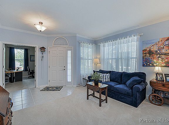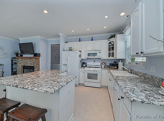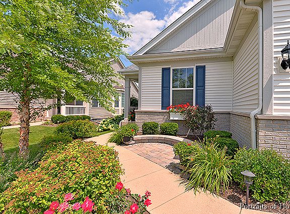 Immaculately kept 2 bedroom, 2 bath home with tons of natural light on a premium lot in desirable 55+-community with pool, clubhouse and tennis courts! Home boasts 2 large bedrooms, den, huge eat-in kitchen featuring white cabinets, beautiful granite countertops, sunroom, huge full basement, crown molding throughout, beautiful brick surround fireplace, large master bedroom, walk-in closet and master bath (handicap equipped) 2-car garage, private bermed yard with patio, sitting wall in front of the home, close to I-88 and Metra! This one is a must see! 1-year home warranty.